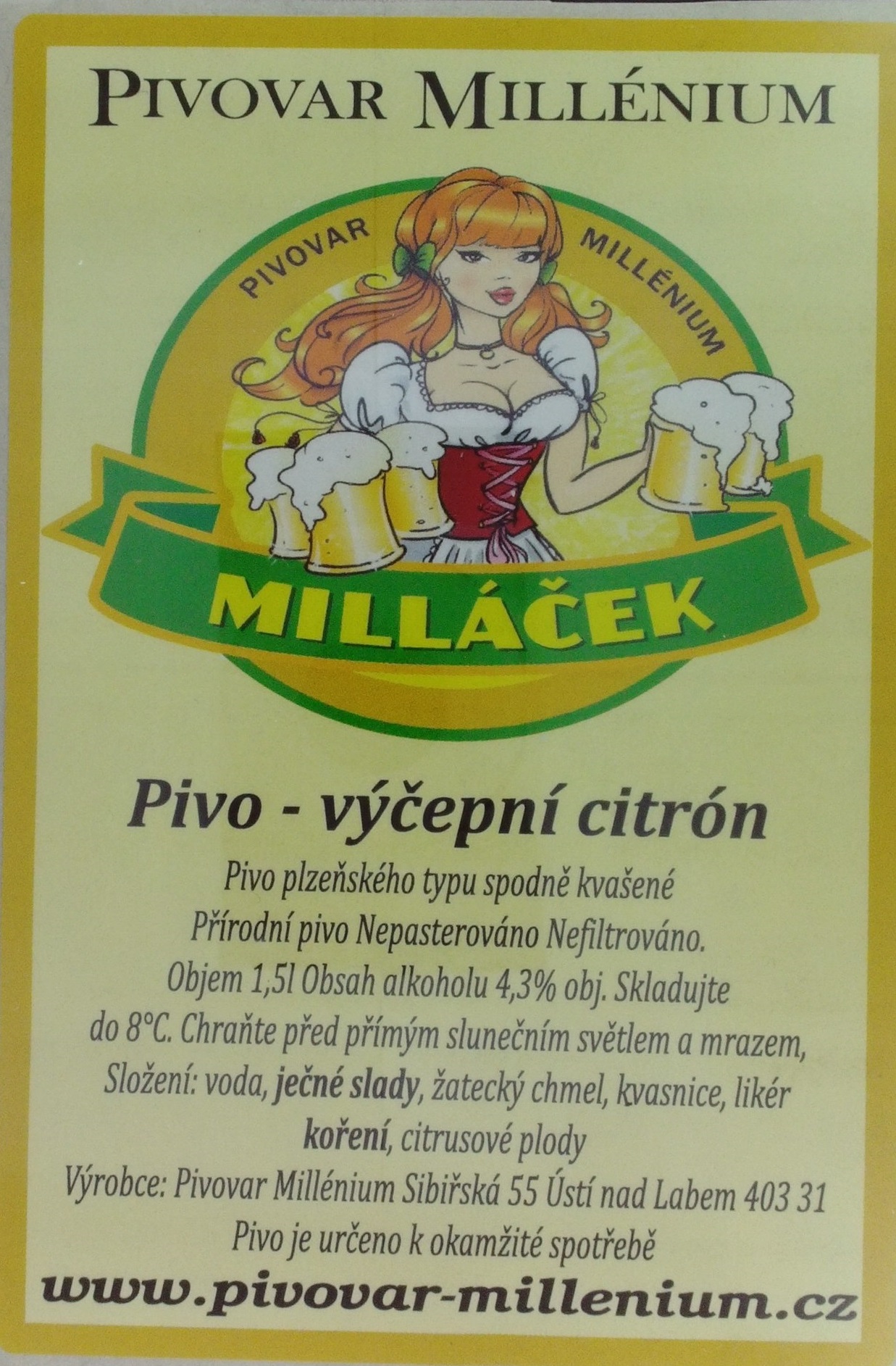 - MILLÁČEK Pivo - výčepní citrón (1,5L) (Millénium-Ústí nad Labem) (S)